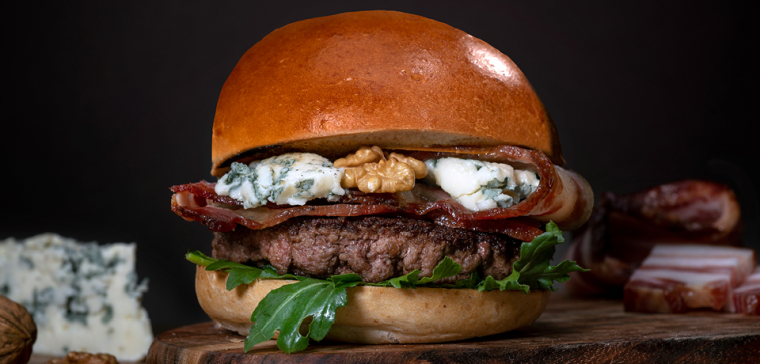Pain brioché, boeuf, bacon, roquefort AOP, cerneaux de noix, roquette.