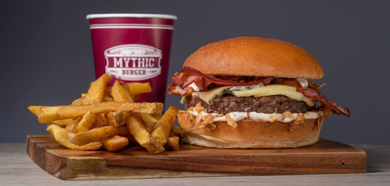 Burger Crousti chicken camembert burger, Bleu Burger OU Reblochon Burger + frites fraîches natures ou potatoes (+1€ sauce Mythic) ou salade